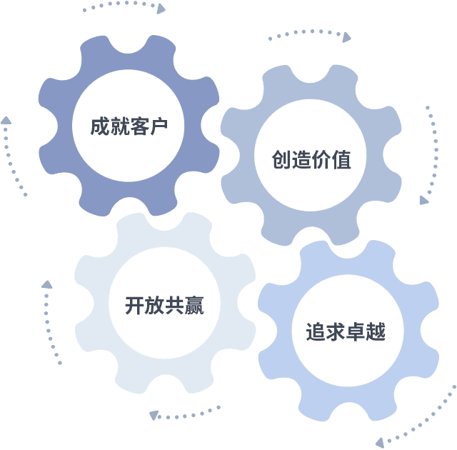 成就客户是一切决策的出发点,,,创造价值是衡量所有工作的标准,,追求卓越是我们做事做人的态度,,,,开放共赢是我们的格局也是最终的结果。。价值观的齿轮环环相扣,,,,推动着组织里的每个人不断向前。。。