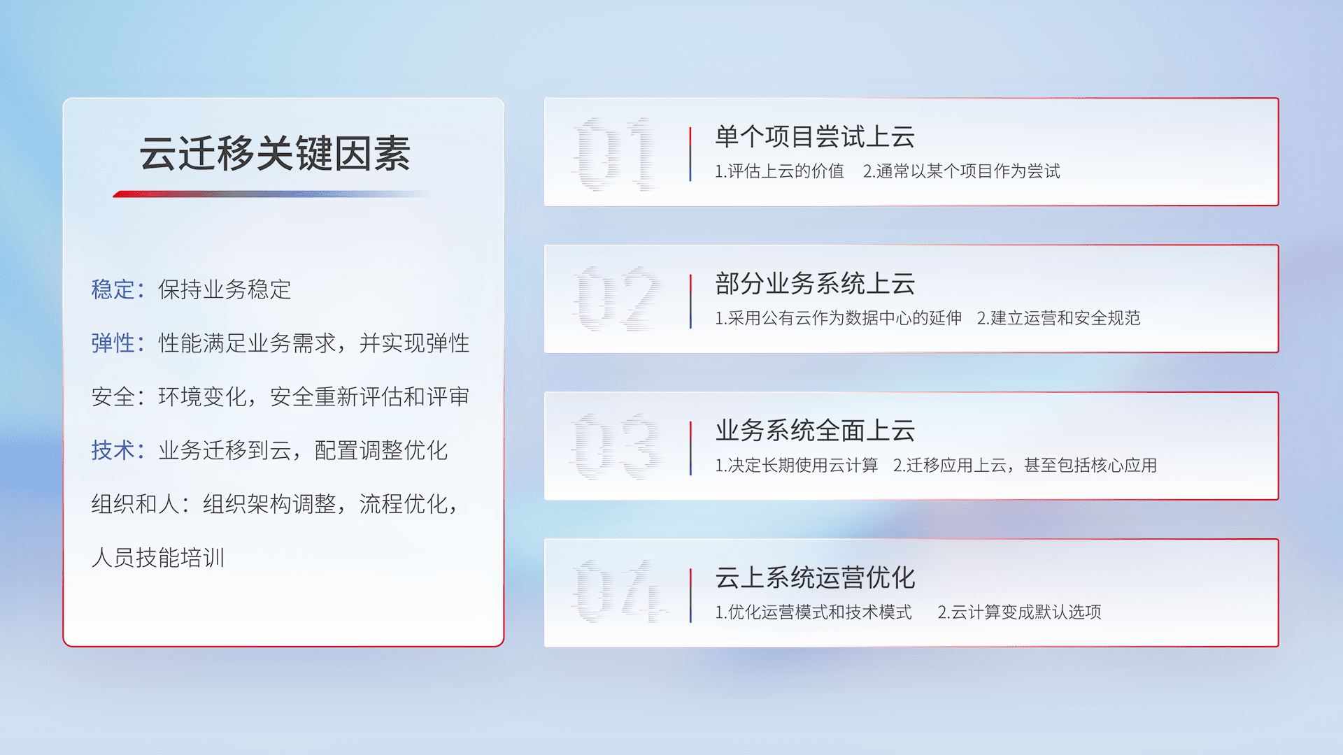 结合实际业务,,,,从规划设计、、、、云平台选型、、云原生改造、、、、数据迁移、、、集成交付,,迁移全过程为客户识别最佳上云路径,,,做好风险识别管理,,,设计网络架构、、身份权限、、、、安全审计合规、、、、操作审计、、、、日志审计、、、、监控告警策略、、、多站点容灾设计等,,对云上基础设施进行整体规划,,,,提升IT治理水平,,,以满足弹性、、、高可用、、高性能的需求。。。。