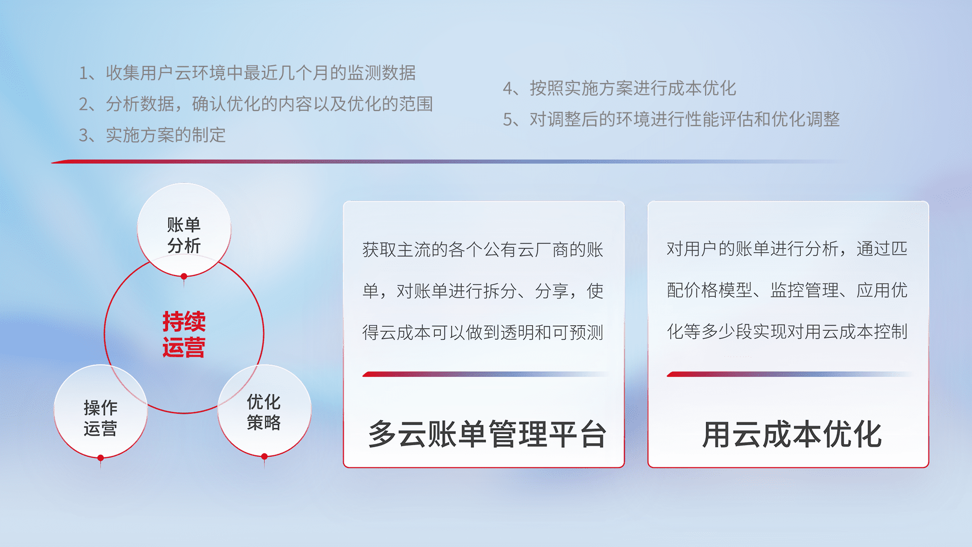 通过多云纳管,,,,以统一的资源数据模型把客户的云资源进行抽象和封装,,,,进而实现对多云资源的统一操作,,,,保障云资源管理的可靠性、、、稳定性与可用性。。。。量身定制化运维内容,,配置、、开发运维、、、补丁管理、、备份、、、监控、、、、认证和访问管理、、审计和日常巡检等,,,,保障在用云过程中的可靠度,,,稳定度以及高可用率。。