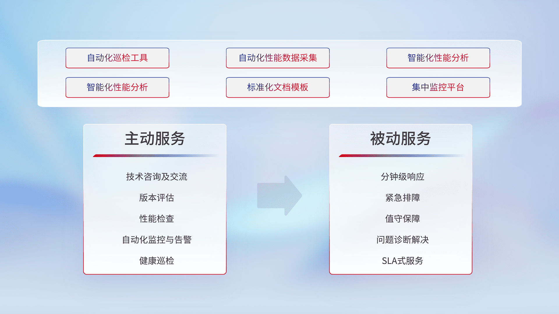 智能化工具和标准化文档,,保障服务质量,,,,提供主动服务(包含技术咨询、、、版本评估、、性能检查、、、、自动化监控与告警、、、、健康巡检)和被动服务包含(分钟级响应、、、、紧急排障、、、值守保障、、、问题诊断解决、、、、SLA服务)。。。。