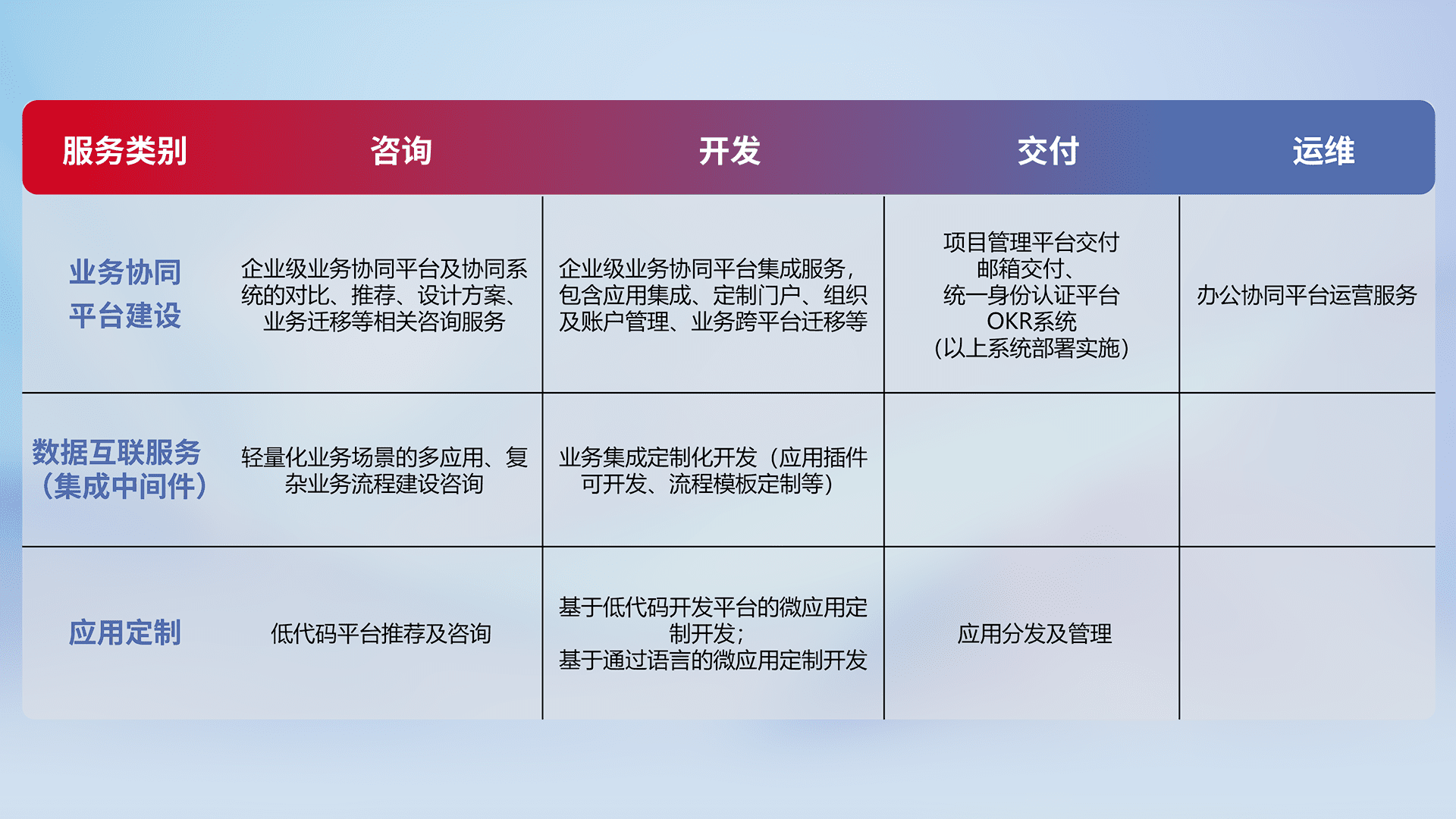 针对钉钉、、、企微、、IDaas等平台级产品提供产品的规划、、方案、、交付、、定制化开发等服务,,,实现如统一协同办公、、智能客户服务、、、、混合会议管理、、智能数据查询、、、、等业务场景,,,实现数字化转型。。